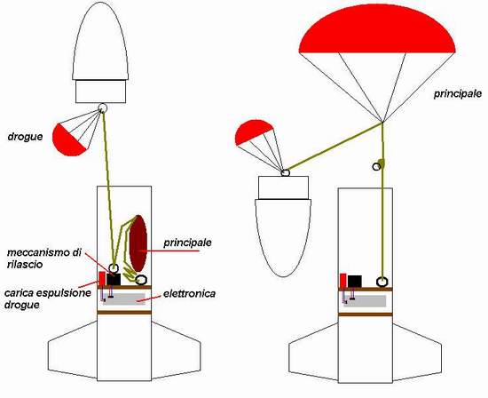 I metodi più comuni per realizzare un sistema di recupero a doppia espulsione sono: Espulsione del drogue comandata dal motore - La carica di espulsione inclusa nel motore espelle il paracadute drogue all'apogeo come farebbe per un sistema a singola espulsione. Un dispositivo elettronico (altimetro o timer) espelle il paracadute principale quando il modello è giunto ad una quota predeterminata. Questo sistema è il più semplice perchè può essere realizzato aggiungendo anche solo un timer per l'espulsione del principale (con qualche svantaggio, vedi Elettronica) ma prevede un calcolo corretto del ritardo del motore e non permette la ridondanza nell'espulsione all'apogeo. Utilizzo di dispositivi elettronici - Coi dispositivi elettronici si comanda l'apertura sia del paracadute drogue all'apogeo o in prossimità di esso, sia del principale ad una quota prestabilita che di solito è intorno ai 200 metri. I dispositivi elettronici agiscono comandando l'accensione elettrica di cariche di espulsione. Il sistema più utilizzato è l'altimetro, in grado di determinare l'apogeo, accendere la carica di espulsione del drogue, leggere la diminuzione di quota ed accendere la carica del paracadute principale al raggiungimento della quota stabilita. Per ulteriori informazioni sui vari dispositivi elettronici vedete la sezione Elettronica. Entrambi i sistemi prevedono che il modello spaziale abbia un alloggiamento ermetico (electronic bay) per il dispositivo elettronico ed uno o due alloggiamenti per i paracadute.