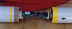 Lo schema più tradizionale di un modello a doppia espulsione è descritto in questo disegno: Il modello ha un compartimento inferiore nel quale è contenuto il paracadute drogue, ed un altro compartimento nel quale è inserito il paracadute principale. Tra i due è collocato il vano che contiene l'elettronica che normalmente è solidale col compartimento del principale. Di questo vano ne parliamo nella sezione Elettronica, ma è importante ricordare che quando i paracadute sono aperti tutto lo sforzo di trazione è sopportato proprio da questo elemento. Il metodo di costruzione più diffuso è utilizzare un accoppiatore per tubi come involucro esterno, due ordinate in compensato per chiudere le estemità tenute assieme da una, due o più barre filettate di opportuno diametro, come mostrato nel disegno in sezione qui sotto: